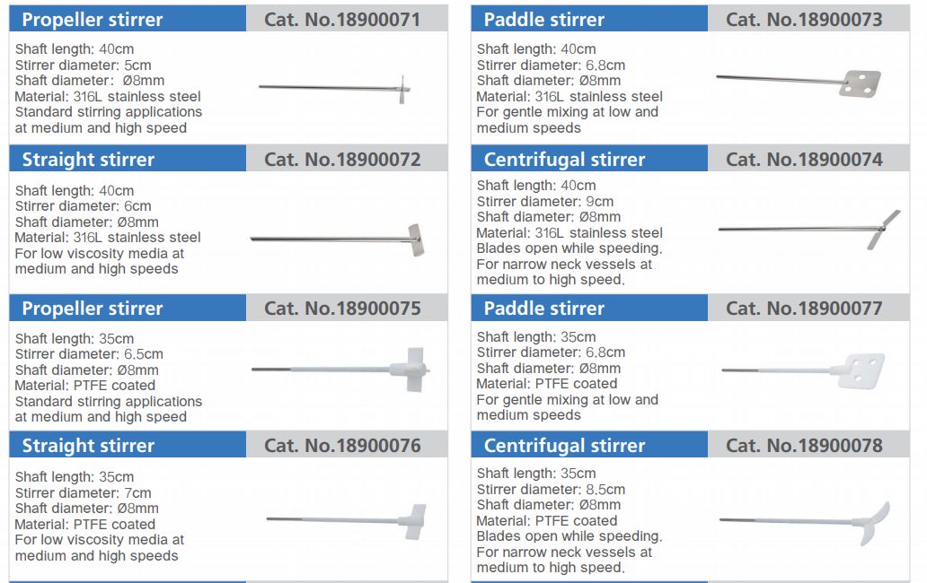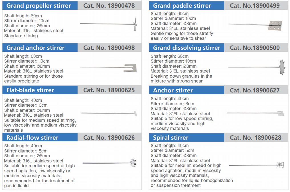 หัวปั่นสำหรับเครื่องปั่นสารละลายความเร็วสูงแบบตั้งโต๊ะ เลือกการใช้งานตามปริมาตรและชนิดของตัวอย่าง โดยมีรายละเอียดดังภาพ